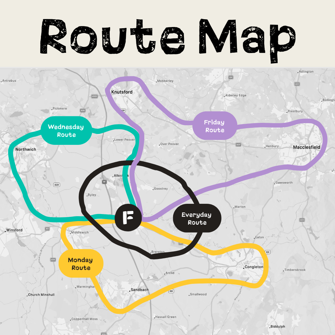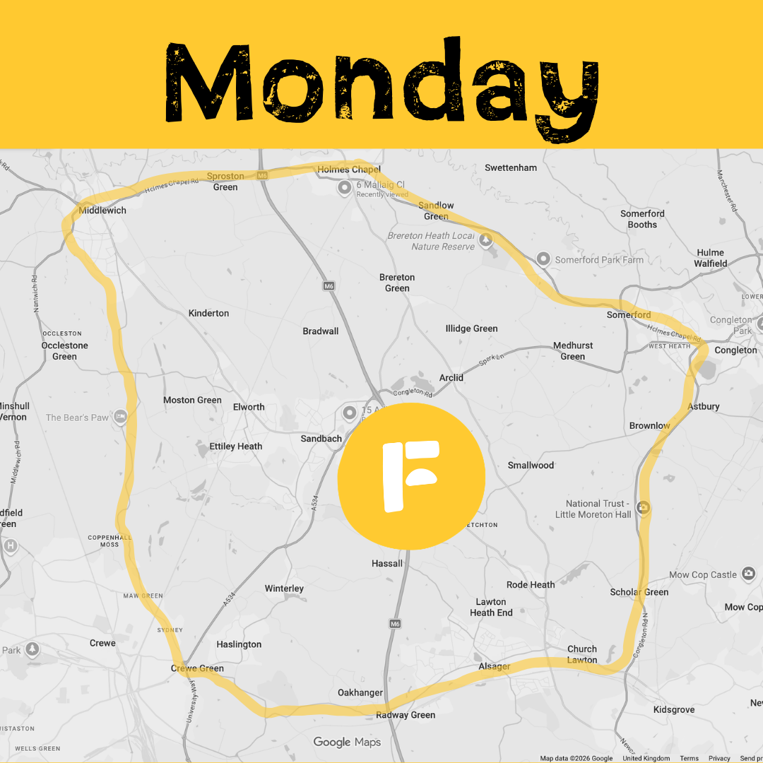 Your Monday delivery focuses on the Sandbach and Congleton areas, ensuring you're stocked up for the week ahead!