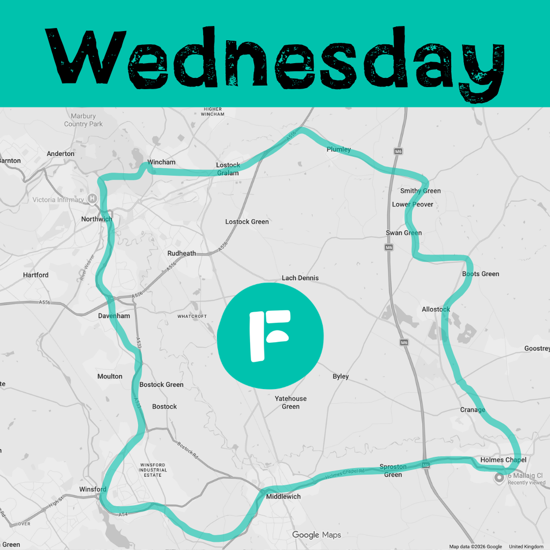 The mid-week route focuses on central towns, covering the key areas of Middlewich and Northwich.
