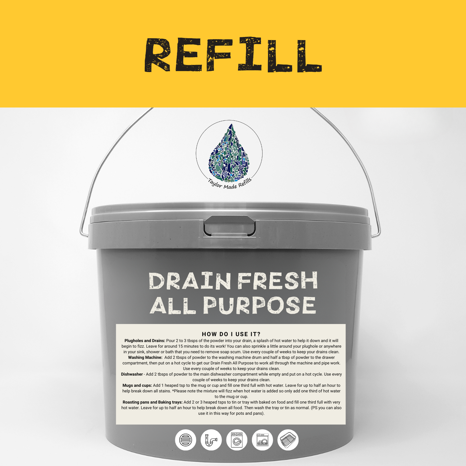 Washing Machine: Add 2 tbsps of powder to the washing machine drum and half a tbsp of powder to the drawer compartment, then put on a hot cycle to get our Drain Fresh All Purpose to work all through the machine and pipe work. Use every couple of weeks to keep your drains clean.